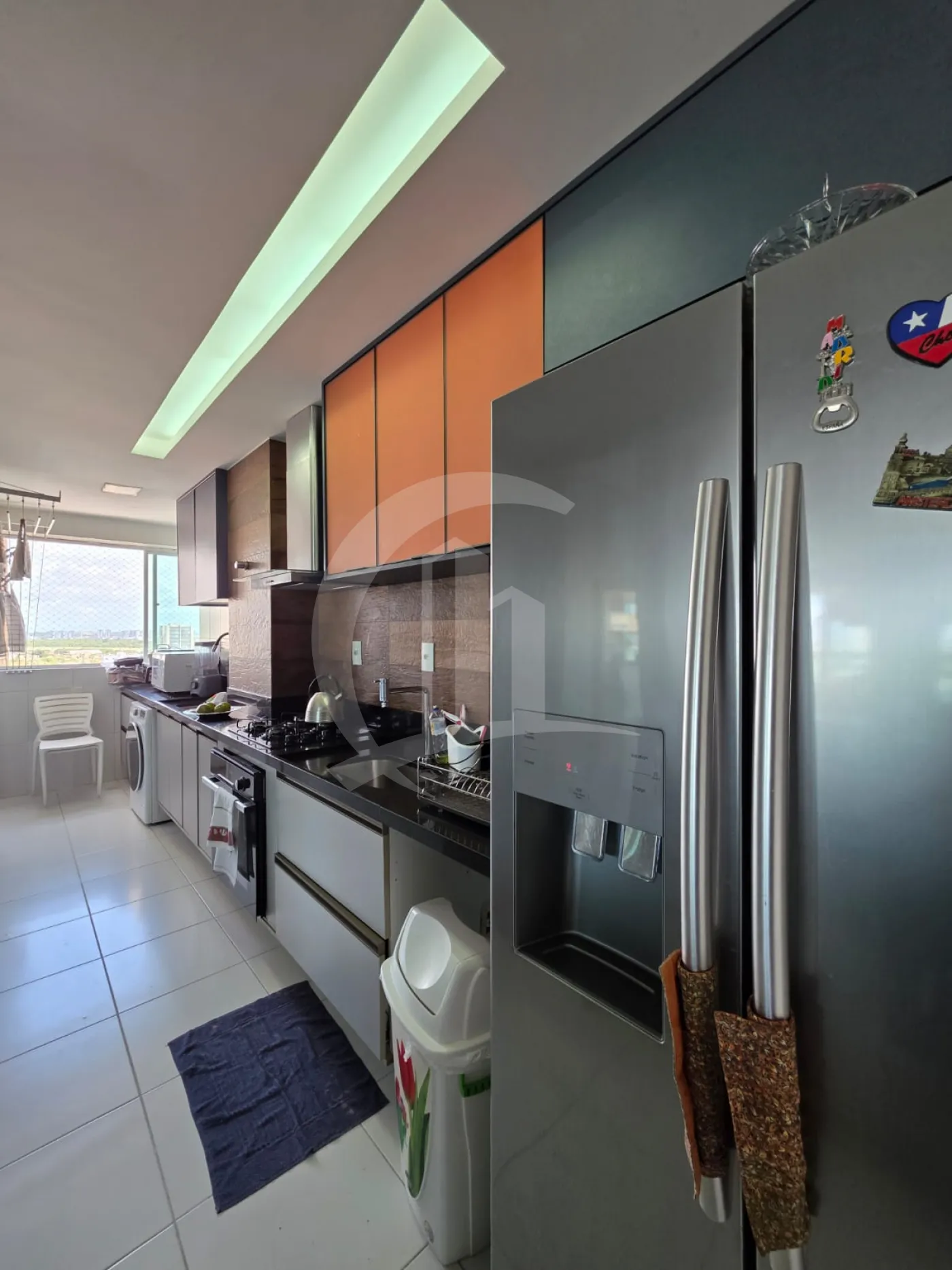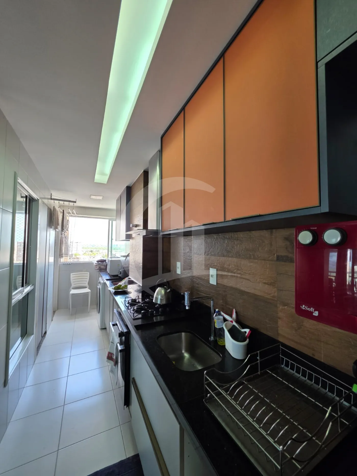 Área de serviço funcional, com armários e banheiro de apoio (DCE)