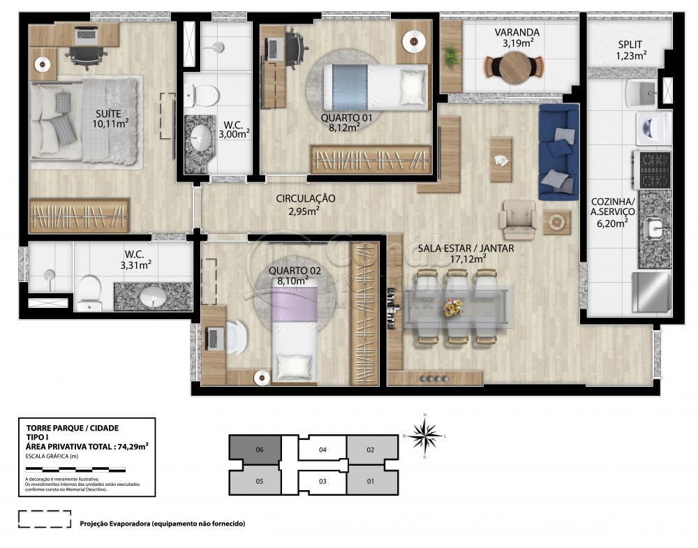 - Apartamentos 74,29m²: 3 quartos, sendo 1 suíte, com piso laminado, infraestrutura para ar condicionado split e ponto de TV. Sala estar/jantar com piso laminado, varanda, cozinha e wc social.