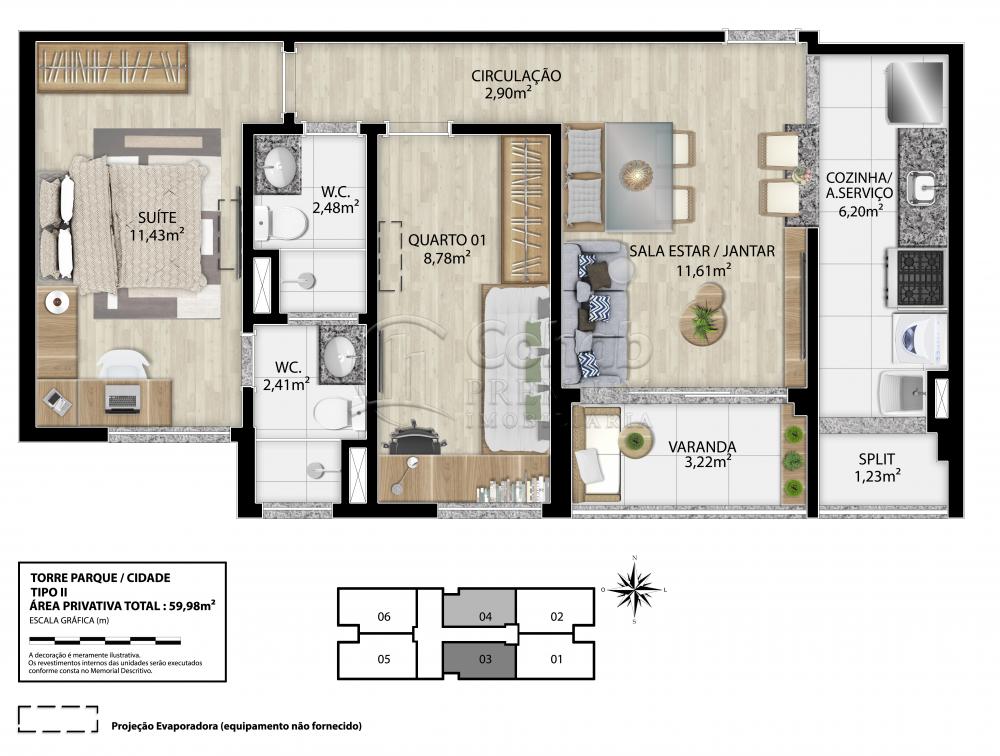 - Apartamentos 59,98m²: 2 quartos, sendo 1 suíte, com piso laminado, infraestrutura para ar condicionado split e ponto de TV. Sala estar/jantar com piso laminado, varanda, cozinha e wc social.
