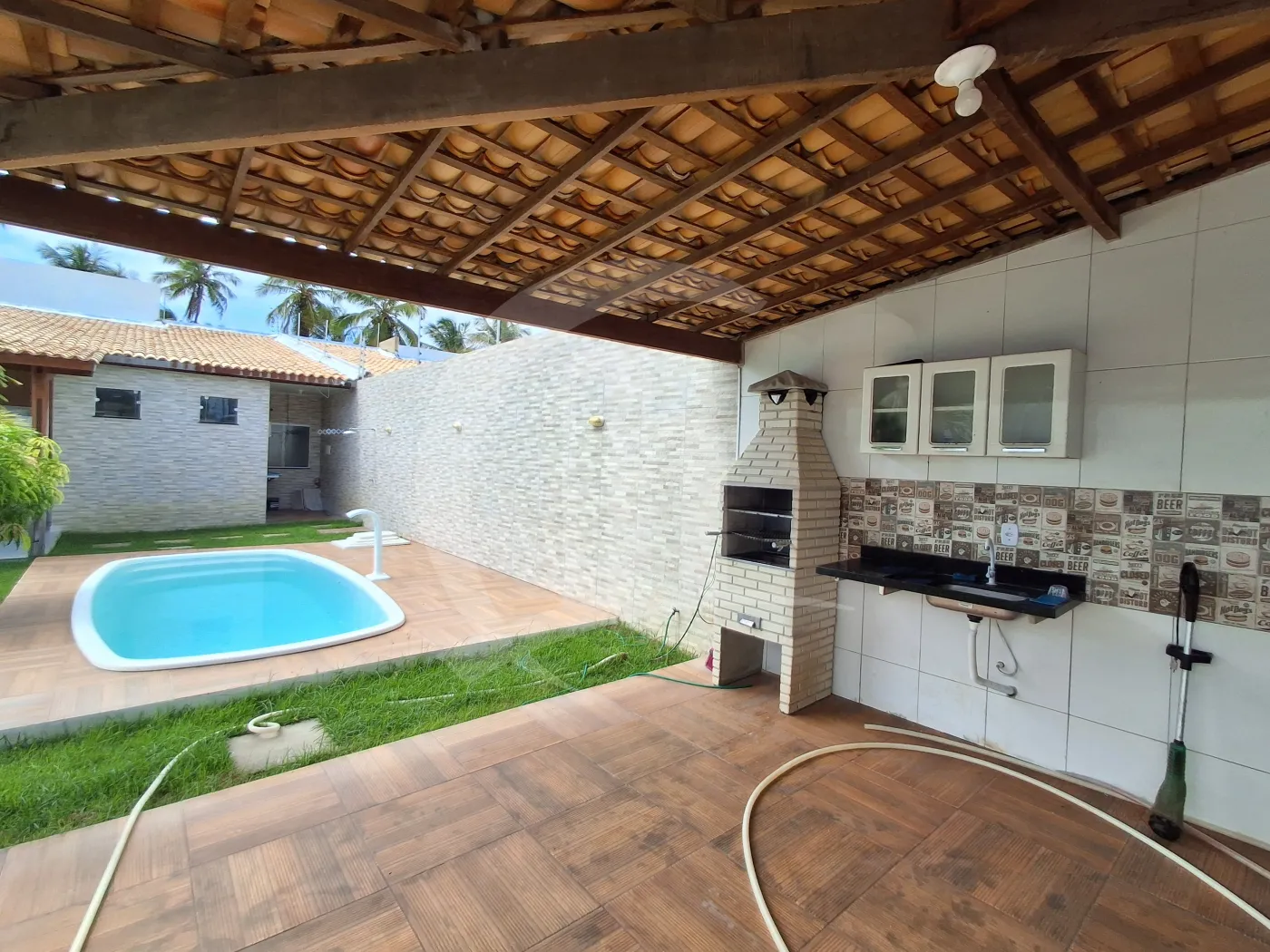 Área gourmet com piscina e churrasqueira.